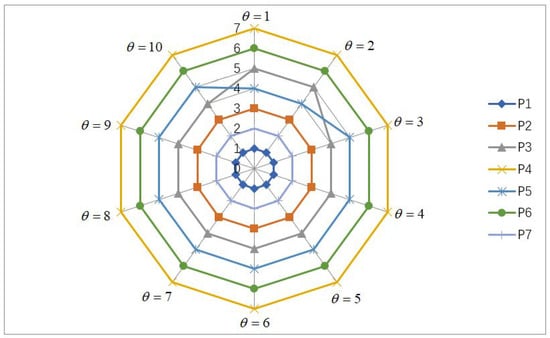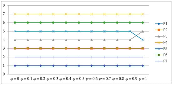 As can be seen from Figure 3, changing the value of the regret avoidance coefficient has little impact on the final ranking result, which is still relatively stable, and the top three are still ; only when the value of and 2, the medium–low-speed maglev system (P5) and monorail system (P3) rank fourth and fifth, respectively. When the value of is greater than or equal to 3, the rankings of the two types are exchanged. Monorail system (P3) ranks fourth, while medium–low-speed maglev system (P5) ranks fifth. From the sensitivity analysis of the above two parts, it can be seen that the model proposed in this paper has strong stability.