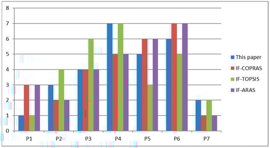 Figure 4 shows the comparison of the ranking results under the four methods. It can be seen that the ranking results under different evaluation methods are different, but the overall trend is the same. The top three are mainly P1, P2 and P7. The best scheme changes between P1 and P7, and the last three are concentrated among P4, P5 and P6. By calculating the Spearman correlation coefficient of the ranking results of the original method and other methods, it can be seen that all the correlation coefficients are greater than 0.78, which shows that the evaluation model proposed in this study is relatively stable. The detailed comparison analyses with other intuitionistic fuzzy decision approaches are illustrated below.