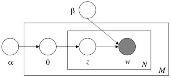 LDA (implicit Dirichlet distribution) was proposed by BLEI and other scholars of Princeton University in 2003 to extract the topic probability model from a corpus. LDA creates a semantic vector space model and assumes that each document is mixed (linearly combined) by any number of topics, and each topic can be represented by word distribution (word item frequency). The probability or weight of each topic in the document and the probability that a word is assigned to a topic are assumed to meet the Dirichlet probability distribution at the beginning. The process of topic simulation generation is conducted through the probability statistics of vocabulary occurrence, to effectively avoid the characteristics of highly noisy text data [], which is suitable for the analysis of microblog short text. The generation process is shown below.