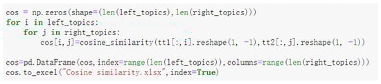 and represent two different topics, and are the keywords under two corresponding topics ω frequency of occurrence. The larger the calculated value, the higher the similarity between the two topics. By setting the threshold, if the similarity value of the two topics is greater than the threshold, the two topics are considered related. For example, calculating the correlation between the topic T1_0 in the first outbreak stage and the topic T2_1 in the first fluctuation stage. First, print out the subject words and their probabilities under T1_0 and T2_1 topics, and then print out the Words_Subject probability distribution, calculate the cosine similarity value of T1_0 and T2_1 through Formula (2). The calculation core code is shown in Figure 3 below. The code uses the cosine_similarity function under the Python open-source code package sklearn.