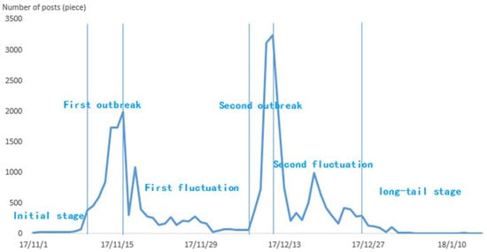 The life cycle is a biological concept, which refers to a series of stages or changes in the form or function of organisms. In essence, it describes the complete life process of organisms from their formation to extinction []. Life cycle theory is also widely used in the study of public opinion. For example, Fink proposed the life cycle models of incubation period, outbreak period, spread period and recovery period to be applied to the public opinion dissemination of emergencies []. Robert put forward the 5R theory of crisis management, that is, the stages of reduction, preparation, response, recovery, and resilience []. Chinese scholars also use the life cycle theory when analyzing the evolution of public opinion, and divide public opinion into different life cycles according to their research contents and perspectives. For example, Chen Fuji referred to the fluctuation of the Baidu index and classified the online public opinion of the “Beijing haze” event into fluctuation period, peak period and decline period []. Cao Shujin divided public opinion into initiation, outbreak, spread and long-tail stages when he studied the temporal development trend of the evolution of public opinion themes on Weibo in public health emergencies []. She Lian divided the life cycle of emergencies into five stages: pregnancy, outbreak, spread, transition, and dormancy []. According to the difference in the number of peak periods of public opinion of public health and safety events, Jiang Jing summarized the evolution mode into three forms: single-peak type, double-peak type, multi-peak type, and pointed out that the evolution process followed the basic process of formation period-development period-peak period-dissipation period []. Based on the life cycle theory, this paper divides the stages according to the characteristics of the public opinion life cycle curve.