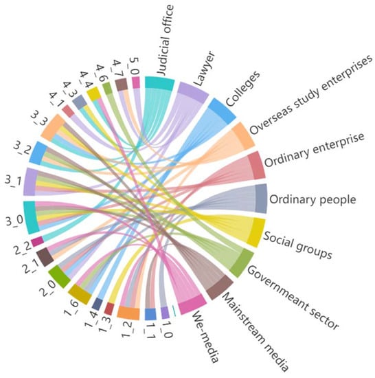 The evolution forms of the topic focus of various stakeholders changing with the life cycle of public opinion can be divided into three types. The first is that the focus of attention is interrelated. The stakeholders in this model include judicial organs, social organizations, and universities (colleges). Most of the three types of stakeholders focus on cases, and the related topics indicate that the three types of stakeholders have a topic center of gravity throughout the life cycle of public opinion, and the focus has always been around this center of gravity. The second category is that in the second outbreak stage, the theme is disconnected from the theme of its previous stage, but re-associated with the theme of its subsequent second fluctuation stage and long-tail stage. Stakeholders with the evolution form of such concerns include lawyers, ordinary enterprises, and we-media. In the second outbreak stage, we-media and ordinary enterprises focused on Topic 3_0: the behavior of Jiang’s mother in Jiang Ge’s apartment after she travelled to Japan. The focus of this topic is based on the words and deeds of the party concerned, thus it is not related to the focus of the previous stage based on the case. After this stage, the topics in the second fluctuation stage and the long-tail stage are based on the parties again, and the concerns are related to each other. After the restoration of facts of the case in court, the focus in the later stage is continuously directed at the parties, and most of them express strong subjective views. When the facts of the case in the second outbreak stage are not clear, the lawyers focus on the parties (topic 1_6) and the general thinking caused by the cases such as women’s self-protection, the role of public opinion in the judicial trial, and whether Liu Xin is guilty (topic 2_0). After the case was opened in Japan, the legal facts were clear, and the lawyers focused on the interrelated contents of the trial. The third type of evolution mode is the disconnection of topic relevance in the second outbreak stage. At the same time, it is different from the second type of mode and is also irrelevant to the topic in the later stage. Taking the topic of the second outbreak stage as the cut-off point, the topic before and after the two public opinion life cycles are interrelated. The stakeholders under this mode include government departments, mainstream media, enterprises studying abroad, and ordinary people. Government departments in the first outbreak and the first fluctuation of the topic based on the case are related to each other, the second outbreak stage of the topic briefly developed to the concern of the parties, after the case opened, the concern of the topic changed to the case. The ordinary people and government departments are just the opposite. The demarcation topic is based on the case itself, which is not related to the topic based on the parties in the previous and subsequent stages. Mainstream media and overseas study companies have been focusing on the same issues since the second outbreak. Although the boundary topic 3_2 and the topics of concern in the subsequent public opinion stage were both based on the case, the content of topic 3_2 was that Jiang Ge’s mother travelled to Japan and held a media meeting before the trial, so it was not related to the topics related to the trial of the case in the second fluctuation stage.