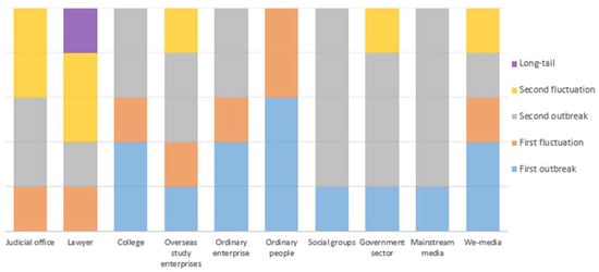 Subsequently, we analyzed the differences in stakeholder attention to inputs at different life cycle stages. Through the five topics that stakeholders pay the most attention to, we can summarize the difference in the attention of stakeholders in different stages of public opinion. As shown in Figure 6, the color of the rectangle represents different life cycle stages, and the longer the length of the rectangle indicates the greater attention to the topic under the corresponding life cycle stage. As can be seen from the figure, except for lawyers, the topics in the late long-tail stage have not become important concerns of the remaining nine categories of stakeholders. Lawyers focus on Topic 5_0 at this stage: Analysis of the legal problems such as the appearance and effectiveness of Liu Xin’s testimony in the trial, the defense made by Chen Shifeng’s lawyer in the trial, the failure of witnesses to appear in court and the refusal of lawyers to apply for evidence collection in connection with the Hangzhou nanny arson case. Enterprises studying abroad and we-media have focused on public opinion topics in the first and second outbreak and fluctuation stages, and showed long-term and continuous attention and participation over the whole life cycle of public opinion. Universities and ordinary enterprises have focused on the topics before the trial in Japan in the stage of the first outbreak, the first fluctuation, and the second outbreak. The judiciary and government departments have focused on three stages in the whole life cycle. The judiciary department has focused on the topics in the first outbreak, the first fluctuation, and the second fluctuation; Government departments have focused on the topics in the first outbreak, the second outbreak, and the second fluctuation stage, among which the topics in the second outbreak were the most concerned, which also reflected the rapid and immediate response of government departments to public opinion. Ordinary people, social groups, and mainstream media all have focused on two stages. Ordinary people focus on the first outbreak and the first fluctuation stage and pay great attention to topics that very easily stimulate emotion, such as the contradiction and entanglement between Jiang’s mother and Liu Xin. Social groups and mainstream media focus on the same stage, both for the first outbreak stage and the second outbreak stage.