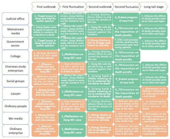 From the perspective of the content of the topic of concern, the evolution types of the topic of concern of stakeholders with the evolution of the life cycle can be divided into four categories: the whole process is based on the case, the focus of attention evolves from the parties to the case itself, the focus of attention evolves from the parties to the case and then returns to the attention of the parties, and the focus of attention evolves from the case to the parties and then returns to the case itself. Stakeholders under corresponding categories: Judiciary and mainstream media; Study abroad groups and enterprises; Lawyers, ordinary people, We-media and ordinary enterprises; Government sector. Due to the serious nature of the three types of stakeholders, the judiciary, government departments, and mainstream media, the focus of attention in the life cycle of public opinion is based on the objective perspective of the case: the focus of mainstream media focuses on the latest progress and situation of the case under different life cycles; in addition to paying attention to the progress of the case, the judicial organs and government departments paid attention to the legal issues in the case at the first outbreak and the long-tail stage. For example, in the first outbreak stage, when the legal facts of the case were unknown, they paid attention to the abuse and moral condemnation of the survivor Liu Xin’s evasion and inaction by the public opinion, guiding the reflection on the dialectical relationship between judicial trial and moral trial, and emphasized the balance between public opinion discussion and public opinion trial. In the long-tail stage, all three types of stakeholders paid attention to the sentencing of the death penalty, including the trial scene of the death penalty, the different attitudes of China and Japan towards the death penalty, and whether Chinese law can hold the murderer accountable. Among the three types of stakeholders whose evolution model belongs to the second category, universities, and enterprises studying abroad focused on the parties Jiang Qiulian and Liu Xin in the early stage, focusing on their interview contents and meeting details, as well as the origin of their grievances in recent years. In the early stage, social groups focused on the derivative events caused by netizens’ human flesh behavior against Liu Xin: an old man in Qingdao was attacked innocently and called for a return to rationality. Under the second outbreak stage, with the trial of the case, the facts gradually became clear, and the concerns of the three types of stakeholders evolved into the concerns of the case. The four types of stakeholders under the third focus content evolution model focused on the parties under this public opinion life cycle. The concerns of ordinary people focused on Jiang’s mother and Liu Xin, made more subjective remarks, expressed sympathy and support for Jiang’s mother’s experience, and expressed strong condemnation of the words and deeds of the beneficiary Liu Xin. Although we-media also focused on Jiang Mu and Liu Xin in the first outbreak stage, they were different from the expression of emotional views of ordinary people. They paid attention to the interview contents and meeting details of Jiang Mu and Liu Xin, and their views were more objective. In the first fluctuation stage, attention was paid to the social problems caused by the case. With the hearing of the case in Japan, we have paid attention to the self-statement of the murderer, the loopholes in Liu Xin’s testimony, and the judgment results. It can be seen that this focus of attention of we-media is controversial and easy to trigger public discussion. Compared with the focus of mainstream media on the restoration of the truth of the event, we-media mostly involves the focus on emotional tendency, which regulates public attitude and emotion [] in line with their purpose to improve their account traffic and attention. Although the concerns of lawyers evolved from the parties to the case and then returned to the parties, it can be seen from the figure that their concerns about the parties and cases are relatively average and show no obvious tendency.
