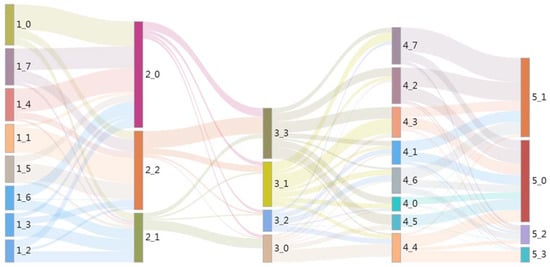 Calculate the cosine similarity of topics in adjacent life cycle stages, and draw the focus evolution path diagram according to the calculated data results, as shown in Figure 8. The vertical line represents the topic of focus. The similarity between topics is represented by connecting lines. The thicker the line, the higher the similarity between them. Finally, the threshold is selected through multiple experiments.