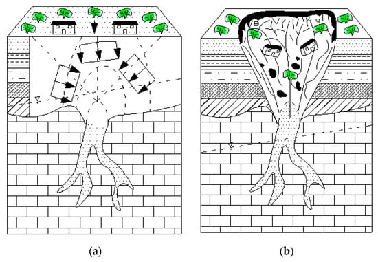 Limestone strata containing shallowly buried Karst caves. (a). Before collapse; (b). After collapse.