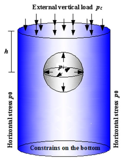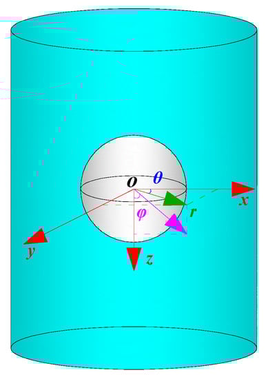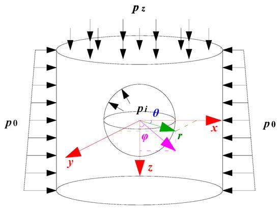 Based on China’s stress field and the Karst topography characteristics (Figure 1), a three-dimensional model was generated (Figure 2), and the cylindrical coordinates, as well as the spherical coordinates, were selected as the coordinate system (Figure 3). The basic assumptions are (a) the mathematical model was axisymmetric, (b) the spherical Karst cave was shallowly buried (h < 2.5 D) and the inner space was filled completely, and (c) the limestone strata were homogeneous, continuous, and isotropic.