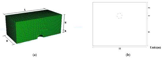 Sketch of numerical simulation model. (a) 1/4 geometry model, and mesh; (b) The dimensions of numerical simulation model.