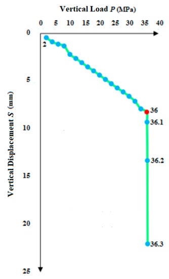 Figure 10 is the P-S curve using monitoring data (B point in Figure 9), which shows the relationship between vertical load and vertical subsidence. When the applied vertical load reaches 36 MPa (red point in Figure 10), the small change of vertical load will bring a sudden shift of vertical subsidence. So, the value of 36 MPa is the value of the bearing capacity. In addition, the value of the bearing capacity is 37.94 MPa using the bearing capacity calculation formula. A value comparison indicates that the error is less than 5%, and the results verified the rationality of the formula.