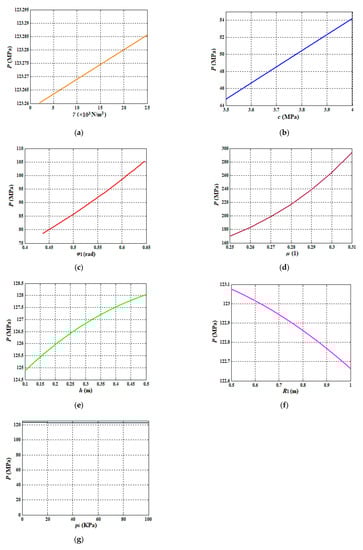 The curves of the bear capacity of limestone strata caused by a single influencing factor. (a) The range of γ value is from 2 kN/m3 to 4 MPa. (b) The range of c value is from 3.5 MPa to 25 kN/m3. (c) The range of φ1 value is from 0.43 rad to 0.63 rad (d) The range of μ value is from 0.25 to 0.31. (e) The range of h value is from 0.1 m to 0.5 m (f) The range of R1 value is from 0.5 m to 1.0 m. (g) The range of pi value is from 0 kPa to 100 kPa.