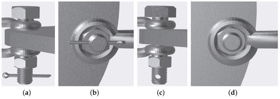 3D display of the bolt. Position relationship between the pin and the bolt from the (a) front view and (b) from the bottom view. Bolt component without the pin (c) from the front view and (d) from the bottom view.