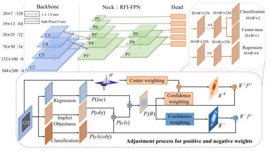 The real feature information is added to the shallow layer in feature extraction network, and the bivariate Gaussian function is added in the training process of centerness branch to obtain the overall framework of detection model. As shown in Figure 3, in the top-down connection of feature extraction, sub-pixel convolution is used to replace 1 × 1 convolution and upsampling in FCOS, which reduces the information loss caused by interpolation in upsampling. Then, the bottom-up connection is added to transfer the low-level features with more localization information to the high-level features, so that the feature output layer not only has semantic features, but also has more real high-resolution location information for localization tasks. The purple box in Figure 3 shows the training process of positive and negative samples. Compared with the calculation of positive and negative samples of FCOS algorithm, this paper adds the bivariate Gaussian distribution of object as a prior knowledge in the calculation process of positive and negative weights, the sample weight is multiplied by the sample confidence to obtain a positive/negative sample. The process mentioned above is called the Label Adaptive Allocation (LAA). The advantages of label adaptive allocation are that the convergence of training process of irregular objects with a large background in ground truth is fast and the corresponding detection accuracy is high; however, for objects with regular shapes, label adaptive allocation is not very beneficial and has low-performance. The optimal detection performance is obtained by jointly calculating the loss function of positive and negative samples so as to achieve LAA at the pixel level.
