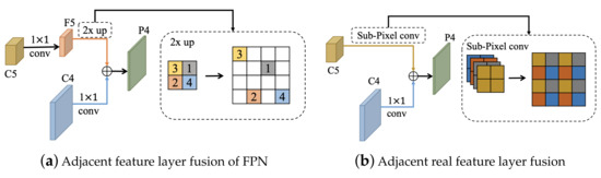 Two different feature fusion methods. (a) The feature layer is enlarged with 1 × 1 convolution and upsampling. (b) Sub-pixel convolution is used to replace 1 × 1 convolution and upsampling to reduce the loss of real feature information in the feature transfer.