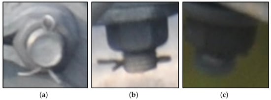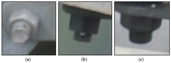 Among the nine object types in this paper, there are two types of defect objects: the missed insulator skirt and the missed pin. Among them, the size of pin is small; so, the distinguishability between defect and normal states of the pin is low. The lack of the pin is mainly reflected in synchronization with the bolt. Bolts with a normal pin are shown in Figure 6. Figure 6a–c are the bottle view of the complete bolt structure and the front view of the visible and the invisible pins, respectively. Figure 7a–c shows the bottle view of the bolt with the missed pin, the front view of the visible pin hole, and the front view of the invisible pin hole, respectively. Under the influence of the reflected light, the complete bolt structure in Figure 6c is easily confused with the missed pin in bolt structure in Figure 7c, which causes difficulty for distinguishing the pin from the visible hole. Figure 8 shows the environment scene of typical object aggregation. Figure 8a is the scene of grading ring structure, which includes stay wire double plate, adjusting plate, and multiple bolts. Figure 8b is the scene of strain clamp structure, which includes counterweight, grading ring, stay wire double plate, strain clamp, and bolt. Figure 8c is the scene of insulator structure, which includes the insulator and defect of insulator skirt missing.