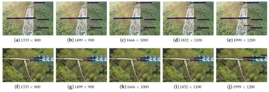 Figure 9 shows the visual results of detected objects with different image size. In Figure 9a, b with small image size, the two counterweight objects located in the top-left visual field are not successfully detected. With the increase in image size, in Figure 9d, the strain clamp located in the top visual field can be detected. In Figure 9e with maximum image size, the small grading ring located in the tower in central visual field is successfully detected. The compared results between Figure 9f–j show that when the input image size is large, the small object of stay wire double plate can be detected in Figure 9j. In summary, the decrease in image size certainly leads to the missed detection of some small or unclear objects, but the objects that are in the majority of the image can be successfully detected by this proposed method.