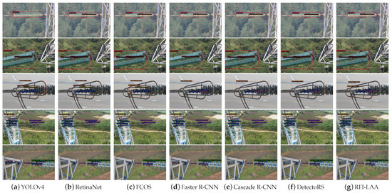In order to intuitively show the detection results, the tested results are compared visually, as shown in Figure 10. Five main scenarios are considered in the inspection of transmission line, double string insulators, parallel double string insulators, grading ring, strain clamp, and tower connection. By comparing the detection results of the most representative algorithm with the algorithm in this paper, we found that YOLOv4 and Faster R-CNN failed to detect missed insulator skirt due to occlusion. In the grading ring scene, the RFI-LAA algorithm not only detected the grading ring and the adjusting plate, but also accurately detected the pin state, which is difficult to detect. For the strain clamp scene, DetectoRS and RFI-LAA successfully detected the corroded pins on the stay wire double plate, which were not detected by other algorithms. In the scene of the tower connection, many bolts without pins on tower were mistakenly detected as missed pins, but only the RFI-LAA algorithm accurately excluded these easily misdetected objects and correctly detected the normal state bolts, which are easy to be confused under the reflected light.