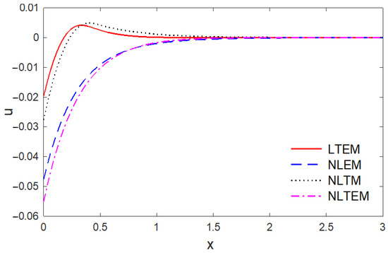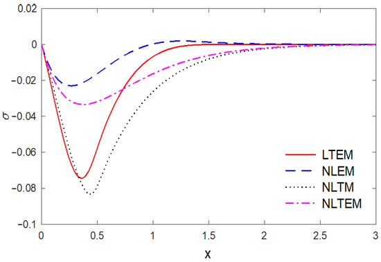 Numerical calculations are carried out for two cases: the effects of nonlocal parameters and the thermal relaxation time. In the first case, we consider four different models: refers to the local thermoelastic model (LTEM), refers to the nonlocal elastic model (NLEM), and refers to the nonlocal thermal model (NLTM), while refers to the nonlocal thermoelastic model (NLTEM). In the second case, we explore four different thermal relaxation time values under the nonlocal thermoelastic model. Figure 1, Figure 2 and Figure 3 depict temperature variations, displacement, and stress distributions for the first case. From these figures, we can observe that temperature decreases with an increase in distance , as in Figure 1. Figure 2 show the displacement variations with respect to distance. It is observed that as distance increases, the magnitude of displacement reduces until it approaches zero. Figure 3 shows the variations of stress versus the distance. It is clear that the magnitude of stress starts from zeros values that satisfy the boundary conditions of the problem; after that, the magnitudes of stress decrease with an increase in to attain maximum values and then they increase again to reach zeros values. The local generalized thermoelasticity model (LTEM), the generalized thermoelastic model with nonlocal elasticity only (NLEM), the generalized thermoelastic model with nonlocal thermal conductive only (NLTM), and the generalized thermoelasticity model with nonlocal thermal conductive and elasticity (NLTEM) are compared in Figure 1, Figure 2 and Figure 3. Figure 4, Figure 5 and Figure 6 show the thermal relaxation time effects under the generalized thermos-elastic model with nonlocal thermal conductivity and elastic (NLTEM). Finally, based on the results, it can be concluded that nonlocal thermo-elasticity theory (nonlocal thermal conductive and elasticity) is a significant phenomenon that significantly impacts the distributions of physical variables.