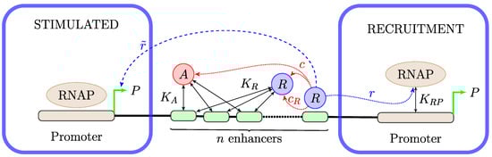 - Stimulated model: the synthesis of P depends on a weighted combination of probabilities of finding the enhancers occupied. These weights are determined for each configuration in terms of the constants, , , and being , , the basal, maximal and minimal transcription rates corresponding to either empty or filled with n activators/repressors. The superscript in denotes the dependence of this maximal rate on the number of enhancers n in the same manner that the minimal rate does. This dependence is a point not considered in standard modelling of the stimulated BEWARE operator that we will discuss in Supplementary Materials Section S1.