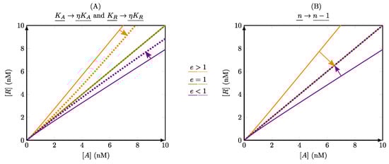 Activation-repression threshold variations under TFs signalling interferences (6) and (7). Thresholds determined by a stimulated BEWARE operator exhibiting different elasticities depending on the values of the model parameters. Orange, green and purple continuous lines are used to represent thresholds with elasticity greater than, equal to or less than one, respectively. In (A) perturbation, (6) has been applied with . In (B) perturbation, (7) is where the number of enhancers changes from to . The thresholds after perturbations are depicted in both cases as dotted lines. Orange and purple arrows show the threshold variations in the elastic and inelastic cases, since in the unit elastic case (green threshold) there is no change, in accordance with Equation (9). Parameter values can be found in Table S4, Supplementary Materials Section S8 and the estimation of the elasticities for these values are in Table 1.
