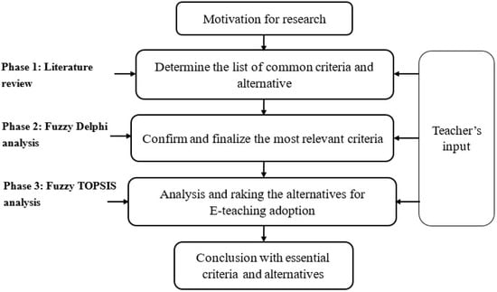 The following is the order of this paper’s structure. Section 2 presents a systematic literature review including e-teaching approaches, e-teaching adoption, and the applications of Fuzzy Delphi and Fuzzy TOPSIS methods. In Section 3, the proposed methodology with Fuzzy-Delphi-TOPSIS tools is expounded upon in detail. In Section 4, the analysis results are demonstrated. Section 5 contains concluding remarks before the reference list.