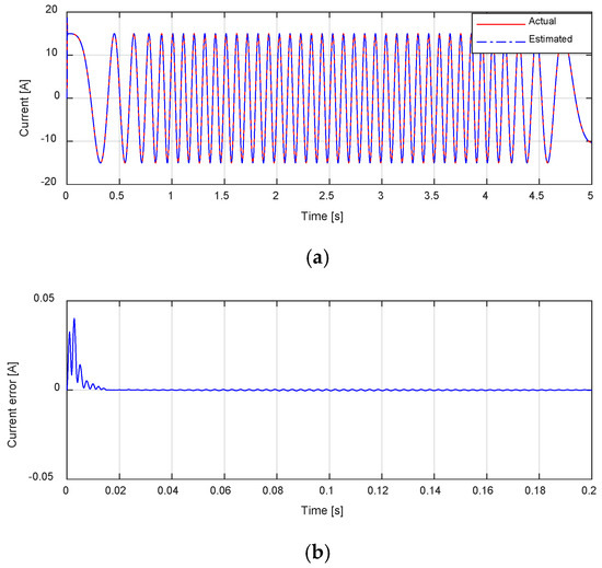 Estimation performance of phase A current. (a) Phase current estimation performance in phase A. (b) Phase current estimation error in phase A.
