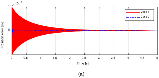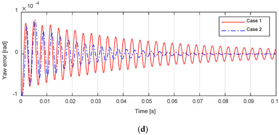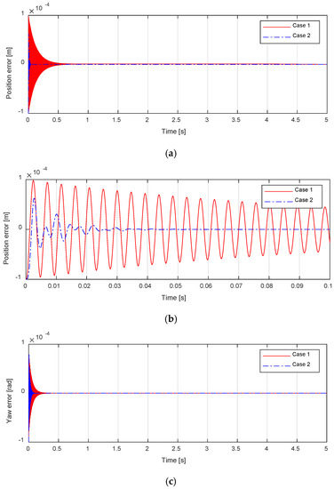 where and are parameters considering uncertainties; and are the uncertainty of the resistor and inductor, respectively. For 10% of the nominal parameters, the position tracking performances of the X-axis and yaw are shown in Figure 8. Compared with the nominal parameter simulation results, Case 1 has a larger settling time. On the other hand, the amplitude of the tracking error and the settling time are similar to the nominal parameter case with the proposed method. This means that the proposed method has robustness against parameter uncertainty since it was designed by considering integral action.