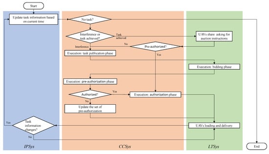 In the case that the UAV is lost, the UAV task completion time is known from the elements in the previous set of authorization information from CCSys (expected arrival time ). If IPSys shares the information with CCSys at this point and it matches the expected change, the task is successfully executed and the auction is not started; otherwise, it means that the UAV is malfunctioning and there is one less bidder in the next auction, so ask IPSys to share the task information at this moment, start a new auction, and delete the previous set of pre-authorization information X and reset the task price vector .
