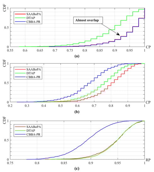 Figure 4) shows that: (a) the CDF curves of the capability performance of the SAABoPA and CBBA-PR almost overlap in the initial case where no interference occurs, and the percentage of capability performance greater than 0.9 is 80% much higher than the 44% of the DTAP; (b) the capability performance of all three algorithms decreases in the presence of multiple disturbances. However, the SAABoPA maintains the best capability performance with 50% of capability performance greater than 0.8 higher than 31% of DTAP and 10% of CBBA-PR; (c) the CDF curves of the resilience performance of SAABoPA and DTAP are close, and the percentage of resilience performance greater than 0.9 is over 90% much higher than 41% of CBBA-PR algorithm. Moreover, the lower limit of the resilience performance of SAABoPA and DTAP still exceeds 0.8, which indicates that SAABoPA and DTAP have stronger resilience performance and better adaptability in the face of interference situations.