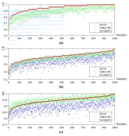 Figure 5. To facilitate the observation of the experimental results, we adjusted the sample serial numbers and reordered the samples in the lowest to highest order of SAABoPA’s metrics. We found that although the experimental parameters are the same, the disaster area environment and UAV parameters (e.g., mission coordinates, UAV speed, etc.) are different for different samples, resulting in different performance metrics for different samples by different algorithms, which we believe is reasonable, and there is a certain applicability of different algorithms to different scenarios themselves, which is why we consider large sample experiments.