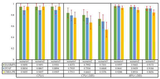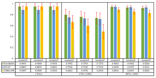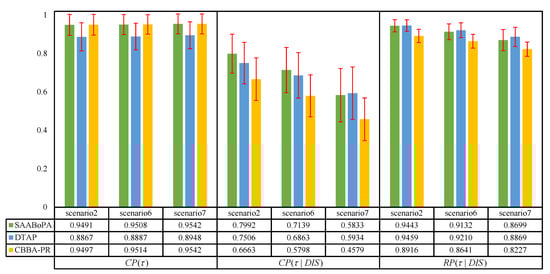 From the results, in the seven scenarios, there are no significant differences in the capability performance of the system without interference under the SAABoPA and CBBA-PR algorithms, but there are significant differences with the DTAP algorithm. However, there are significant differences in the capability performance of the system with interferences under the three algorithms. It indicates that the SAABoPA and CBBA-PR algorithms have similar capability performance in the no interference case and are significantly better than the DTAP algorithm. However, in the case of interferences, the capability performance of the system under the CBBA-PR algorithm degrades more and is significantly worse than SAABoPA and DTAP algorithms. Analyzing