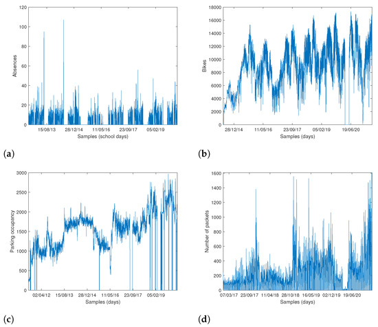 In this paper, we consider several timed datasets with such human activity patterns. Specifically, we obtained data on school absences at a private school in Madrid, data on bike-sharing demand in Madrid city (from the Public Madrid Company BiciMad), data on public parking occupancy in San Sebastián city (Basque Country, Spain), and data from a post office at Azuqueca de Henares (Guadalajara, Spain) about the number of daily packets delivered. Some of these datasets can be freely accessed and downloaded from the Spanish Government data repository at [22]. In addition, all datasets considered in this work can be accessed through the following repository: https://github.com/ksyas/HAP_DB.git (Last accessed date 22 June 2022). In all cases, a prediction problem can be formulated on these datasets as a regression problem, in which the number of absences in a school, number of bicycles rented (demand), percentage of parking occupancy, and number of packets delivered must be estimated. Daily data were considered in all cases, and one-day-ahead prediction was considered. Figure 1 shows the times series of each considered dataset, with details on the date ranges in which the data are available. In addition, we obtained meteorological data for the location of each dataset, using a Reanalysis project (see [23] for a description of Reanalysis data and its use in ML-based prediction problems). Specifically, ERA 5 Reanalysis data from the European Center for Medium-range Weather Forecasts (ECMWF) was used, from which different variables such as temperature or precipitation were downloaded for the dates in which the datasets have samples.