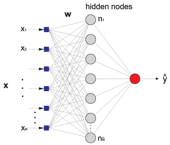 An Extreme Learning Machine (ELM) [32] is a special type of training method for MLPs (see Section 3.1.2). In the ELM approach, the weights between the inputs and the hidden nodes are assigned at random, usually by using a uniform probability distribution. Then, the ELM algorithm calculates the output matrix H of the hidden layer and computes the Moore–Penrose pseudo-inverse [33,34] of this matrix (); see [32] for details. The pseudo-inverse matrix calculation can be carried out as follows:
