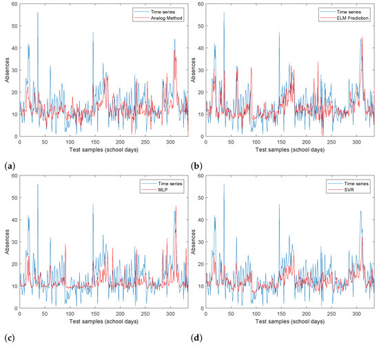 Performance of the different regression techniques considered in the prediction problem on school absences dataset. (a) ANA; (b) ELM; (c) MLP; (d) SVR.