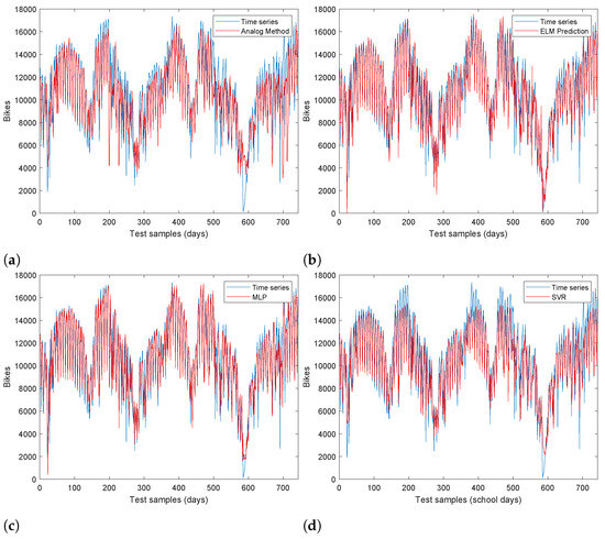 Performance of the different regressors considered in the bike-sharing demand prediction problem in Madrid. (a) ANA; (b) ELM; (c) MLP; (d) SVR.