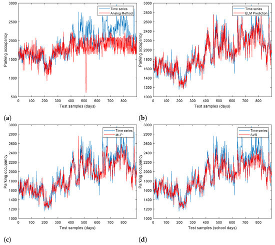 Performance of the different regressors considered in the prediction problem on San Sebastian parking occupancy dataset. (a) ANA; (b) ELM; (c) MLP; (d) SVR.