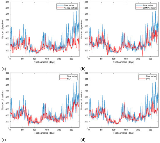 Performance of the different regressors considered in the prediction problem on packet delivery dataset at Azuqueca. (a) ANA; (b) ELM; (c) MLP; (d) SVR.