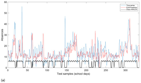 As can be seen, the ANA baseline approach has a high performance in this dataset, indicating that similar days in the past had similar school absence figures. The best performance among all ML approaches is the SVR, which outperforms the ANA approach, with the best MAE of . The effect of including meteorology in the prediction is positive since all methods improve their results when meteorology is considered, which indicates that bad weather has an influence on school absences, especially on the RMSE. ELM and MLP obtain the worst results, even worse than ANA, which is considered the baseline. This result shows that the input variables used for the prediction are not enough for these methods to explain all the variability in the absence problem. Absences could be produced by health problems, such as flu, and maybe seasonal, like in this last example. The last column in the table shows the training time (tt, in seconds) for the different ML regressors considered. As can be seen, the ANA approach is the fastest, and the SVR shows the highest training time among all the approaches evaluated. Note that the ELM is the fastest ML approach. Figure 4 shows the performance of the different regressors considered in the test set of the school absences dataset, including meteorology input variables.