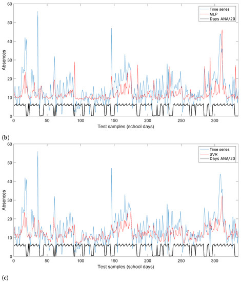 Finally, we analyzed the effect of having similar days in the past (training set) on the performance of ML methods considered. We carried out this analysis by considering the school absences dataset, in which we calculated how many similar days to the current one (n) there are in the training set (). We depict this time series together with the prediction of the different ML regression techniques in Figure 8a–c. In fact, we depict (instead of ) for a better matching with the prediction of the ML algorithms as a black line in the figures. As can be seen, there are day types in the test set without a similar counterpart in the training set, which leads to a lack of similar situations in the past to train the ML algorithms. It is possible to see that the most important prediction errors in all ML algorithms considered are produced on these days without similarity in the training set. This means that having enough information on similar day types in the past (training set) is key to obtaining the good performance of the ML algorithms in these prediction problems with human activity patterns. Note that this behavior is somehow related to the concept of the persistence of the system, a concept related in turn to the memory of the system. More specifically, persistence is an important characteristic of many complex systems in nature, related to how long the system remains in a certain state before changing to a different one [41]. In the case of prediction problems with human activity patterns, persistence is related to the existing information in the training set to predict a given unseen sample in the test set. In other words, the different ML approaches can obtain good predictions when they are trained with similar cases, but if there is not a given persistence level in the system (i.e., there are no similar cases in the past), the ML training quality degrades, as shown in this final experiment for the school absences prediction problem.