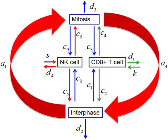 In this paper, four populations are considered. There are tumour cells in interphase, tumour cells during mitosis, NK and CD T cells as immune responses. A flow chart of the interaction model is given in Figure 1. Let and be the population of tumour cells during interphase and mitosis at time t respectively. is pre-mitotic phase called the interphase. and are the immune system population of NK and CD T cells at time t respectively. The assumptions used are based on previous researches and can be summarised as follows,