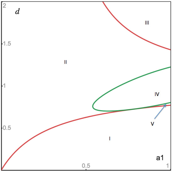 where for the steady state is stable. When , the characteristic Equation (18) has a pair of imaginary roots, , where bifurcation will occurs. As , there is at least one root with positive real part which means that at least one stability switching occurred. If there is no positive root, then the system does not have bifurcation and cannot lead to a stability switching.