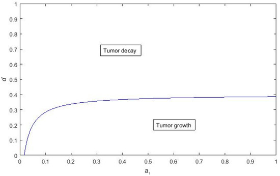 The tumour conditions are represented by the region in Figure 2. Assume that there is no natural death of the tumour cell, . The resulting curves are obtained when the parameters , , , and . The curves show the regions of growth, decay and stability switching. In the absence of delay, , tumour growth is as shown in Figure 3. However, when increases, the region of tumour decay starts to change and becomes smaller. In the case , tumour growth remains at the same region (R-I), while the decay region is subdivided into four regions including the regions of stability switching. For , tumour regions are given by R-II and R-IV and as increases the stability switching occurs at R-III and R-V as shown in Figure 2.