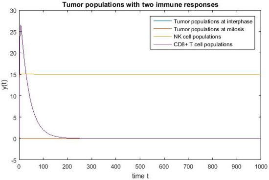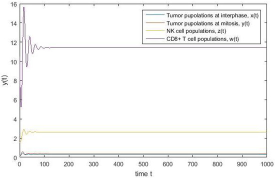 Different values of , , a and d will affect the stability of the fixed point of the system. a represents the total cell lost at the interphase where d represents the total cell lost at the mitosis. The cell lost is the summation of natural death (apoptosis) of the tumour cell and the tumour cells that are killed by the immune system in each phase of the cell cycle. Based on the condition in (5), the tumour would be defeated when there is no immune system interaction since the death rates dominate the growth rate. The literature shows that the rate of natural death (apoptosis) of the tumour cell is very low in the malignant tumour. Hence, we consider the death rate of tumour cells killed by the immune system is higher than the natural death rate of the tumour cells, and . The value of a and d should be higher than proliferation rate of the tumour cell, and , so that the tumour growth can be diminished. In the absence of immune response, these two parameters should be in control in order to maintain the growth of the tumour. However, as far as the immune responses are concerned, it greatly helps to suppress tumour growth by inhibiting their outgrowth. Villasana [24] and Liu [25] have focused on involving one immune response with results showing that the immune cell can suppress the tumour growth. From the results, we extend the model by adding another immune response since there are two types of immune system in the human body, i.e., innate and adaptive immune system. NK cell is a part of the innate system and the first line of defence against viruses and tumours. Once NK cells detect a foreign cell (tumour cell), they will directly attack the latter and give an alert signal to T cells (CD T cell) and generate tumour-specific CD T cell, which is represented by CD T cell in the presented model. Tumour-specific CD T cell is only present in the presence of a tumour cell and helps CD T cell to kill the tumour cell. By including both immune responses from both immune systems, the model is more realistic.