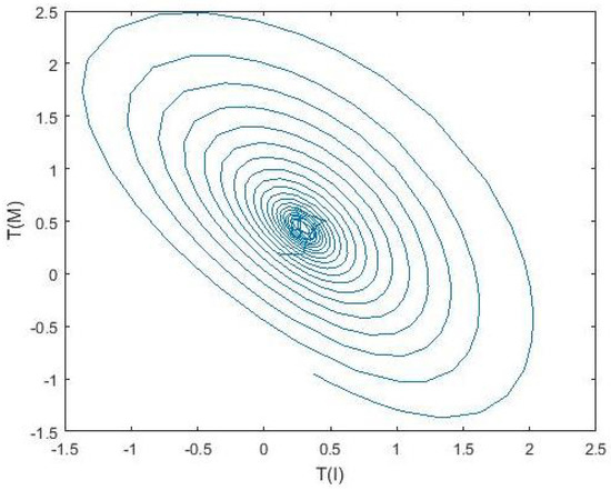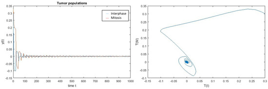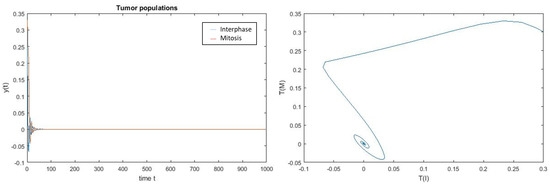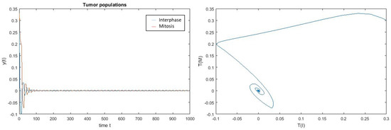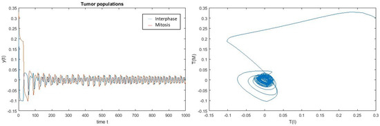 Mitosis is the phase where two daughter cells are produced from a single cell. A tumour cell from interphase that completes the process will enter mitosis to complete the cycle. The tumour cell can be controlled from dividing if we can control the number of cells that enter mitosis. If the number of cells that enter mitosis decrease, then we can reduce the number of tumour cells produced. The effects of proliferation rate, , are varied in order to see the changes of the tumour populations in interphase and mitosis. We choose as 1.2 and 0.7, respectively. If the value of , the system oscillates and becomes unstable since a high proliferation rate can tolerate more tumour cells in the system, resulting in tumour growth as in Figure 18. However, the system is stable when the rate of proliferation is decreased, as in Figure 19.