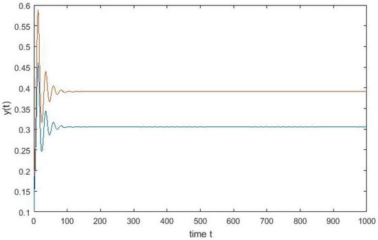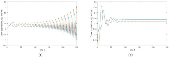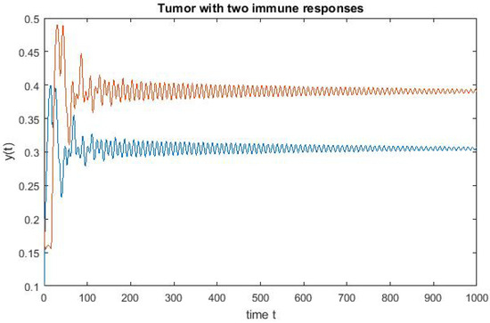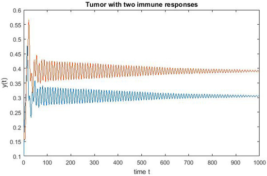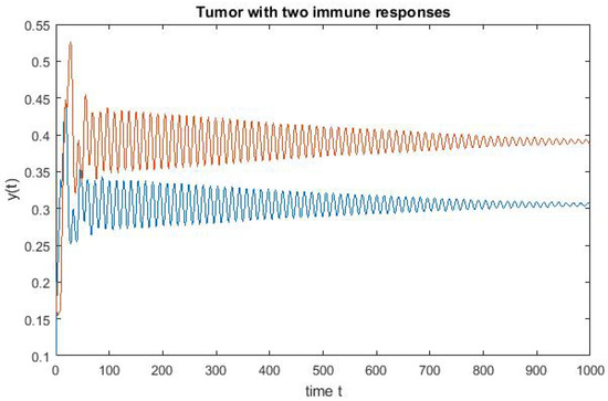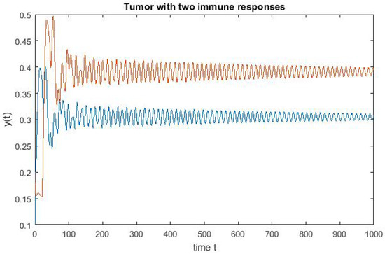 Now, set parameter as , , , , , , , , , , , and . In this case there are two fixed points: and . By computing the roots as given by Equation (14), it can see that is unstable for all values of delay. However, has stability switching where the stability of the fixed point switches from stable to unstable at some . Again, at some , the system switches from unstable to stable. Oscillations around this fixed point would therefore correspond to a tumour which grows and shrinks with no application of treatment. Figure 9 and Figure 10 were generated using MATLAB.