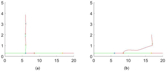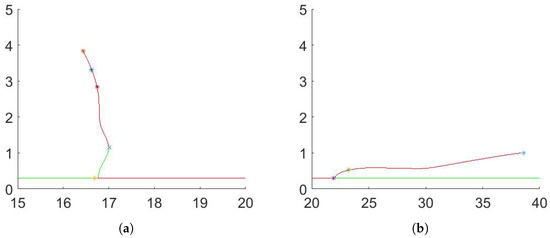 Periodic solutions from Hopf bifurcation (∗) at different values of for the system (1), (a) ; and (b) ; at . Stability switching occurred from stable (green line) to unstable (red line) and vice versa.