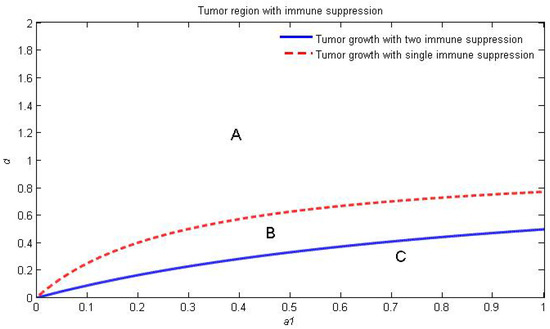Regions of the stability of and d are obtained. d represents the total cell loss at mitosis. Region A represents tumour decay and Region B and C represent tumour growth. When two immune suppressions are added, the curve lies consistently below the curve with single immune suppression.