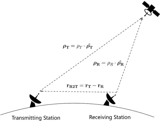 Given the geocentric position of a transmitting station, the geocentric position of the receiving station and the corresponding topocentric position of the space debris , , the geocentric position of space debris can be expressed as or . As shown in Figure 1, there are two types of observation for bistatic radars.