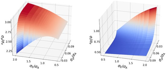 As discussed in Section 2, there are mainly two types of observation for bistatic radar, and the accuracy of radar ranging is usually better than that of angles. From Equation (12), the results of estimation change with the relative weight between different observations, instead of the absolute weight of observations. In normalized units which the unit of distance is the radius of Earth, and the unit of angles is radian, variation in the relative error between the sum of ranges and azimuth () was set from 0.1 to 0.02, and variation in the relative error between elevation and azimuth () was set from 0.5 to 2.0. Like the relative errors of observations being used to describe weight, the relative error between different orbital elements is used to describe the accuracy of certain orbital element. By setting the error of the estimated eccentricity as the reference, the relative error between the semimajor axis and eccentricity () can represent the accuracy of the estimated semimajor axis, and the relative error between inclination and eccentricity () can represent the accuracy of the estimated inclination. The effects of weight on the accuracy of estimated orbital elements are shown in Figure 2.