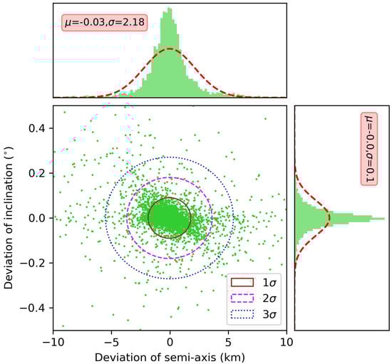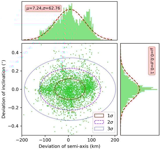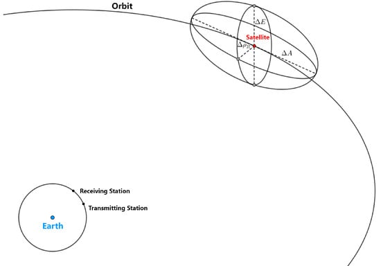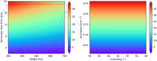 was easily found to always be positively associated with the absolute error of an orbital element. This feature can substantially simplify the calculation because the extreme value is sufficient for calculating the confidence zone of instead of traversing all possible errors of orbital elements. Figure 6 also shows that became smaller for the satellites of a higher altitude with the same semimajor axis error. The effect of the right ascension of the ascending node () was almost identical to that of inclination, which demonstrates that the orbit plane had no direct relationship with .