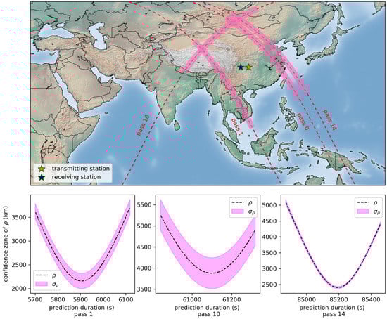 Figure 7 shows that in one tracklet could vary by several thousand kilometers for a satellite with an altitude of 500 km, while only varies little. This shows that barely had a relationship with . is not always positively associated with prediction duration. If drops, either the error of velocity or the error of azimuth and elevation grows.